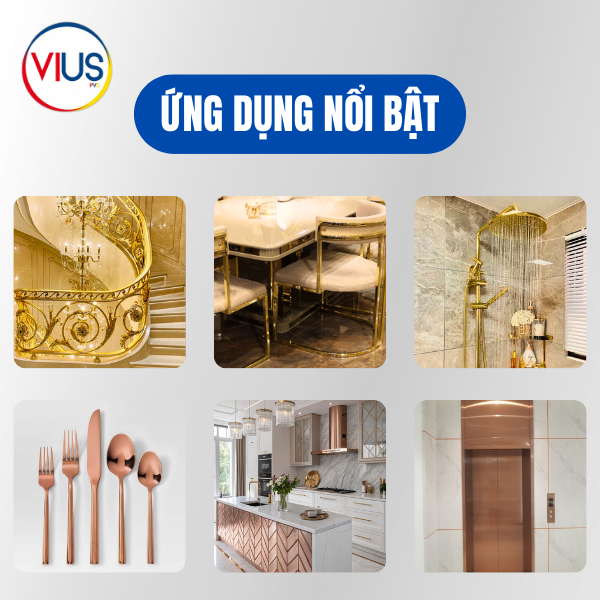 Về thẩm mỹ, lớp phủ PVD cho phép tùy chỉnh đa dạng màu sắc thời thượng như vàng gold, vàng hồng, đen, đồng cổ, giúp sản phẩm Inox mạ PVD trở nên cao cấp mà vẫn giữ nguyên tính chất tự nhiên. Ngoài ra, quy trình mạ chân không PVD thân thiện với môi trường, không sử dụng hóa chất độc hại, an toàn cho sức khỏe người dùng.
